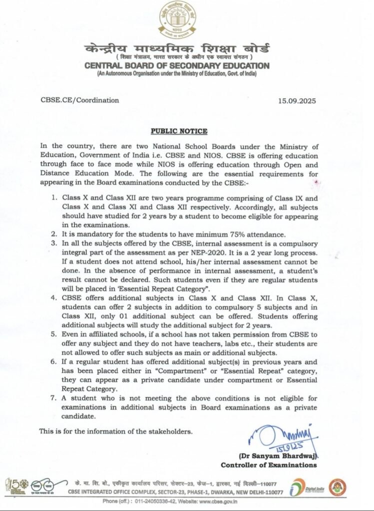 CBSE New Rules: केंद्रीय माध्यमिक शिक्षा बोर्ड ( Central Board of Secondary Education) की तरफ से 10वीं और 12वीं की बोर्ड परीक्षा को बड़ी अपडेट जारी की गई है , बोर्ड परीक्षा के लिए सीबीएसई ने योग्यता शर्तें बनाई है , सीबीएसई बोर्ड की तरफ से एक पब्लिक नोटिस जारी किया गया है जिसमें बोर्ड में 10वीं और 12वीं की बोर्ड परीक्षा के लिए नियम और शर्तें निर्धारित किए हैं , कुल 7 पॉइंट्स दिए गए हैं बताया जा रहा है कि सीबीएसई बोर्ड क्लास 10th और 12th बोर्ड परीक्षा एग्जाम में बैठने की अनुमति तभी दी जाएगी जब हुए इन नियम और शर्ट को पूरा करेंगे। सीबीएसई ने यह पब्लिक नोटिफिकेशन 15 सितंबर 2025 को जारी की है आईए जानते हैं क्या है नोटिस की पूरी जानकारी।