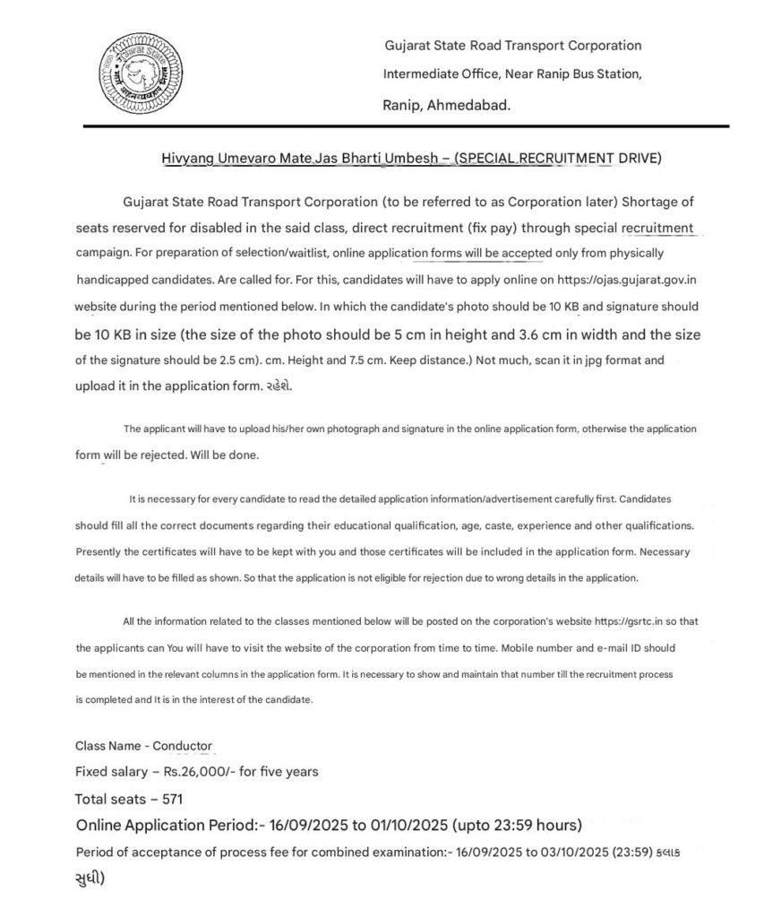 Roadways Conductor Notification 2025: रोडवेज में कंडक्टर बनने का शानदार मौका आ चुका है रोडवेज में कंडक्टर के कुल 571 पदों के लिए आधिकारिक रूप से नोटिफिकेशन जारी की गई है , गुजरात राज्य सड़क एवं परिवहन निगम ने कंडक्टर की खाली पदों के लिए आवेदन फार्म आमंत्रित किया है इसके लिए ऑनलाइन आवेदन फॉर्म 16 सितंबर 2025 से भरे जा रहे हैं और आवेदन फॉर्म भरने की लास्ट डेट 3 अक्टूबर 2025 है रोडवेज में कंडक्टर के पदों पर चयनित होने पर अभ्यर्थियों को हर महीने 26000 रुपये सैलरी दी जाएगी।